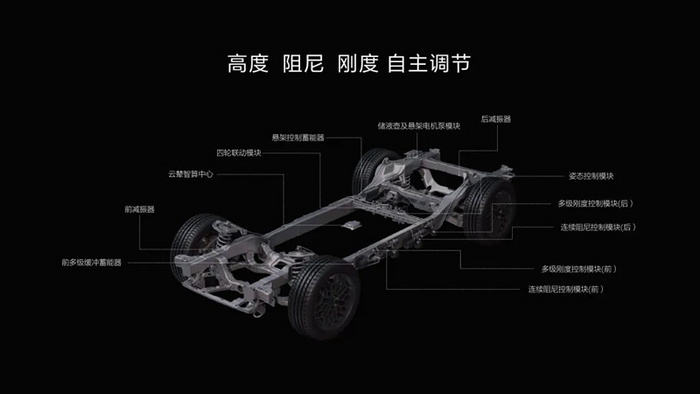 云辇-P智能液压车身控制系统,三级刚度调节,悬架调节总行程150mm,目前没人可以做到。