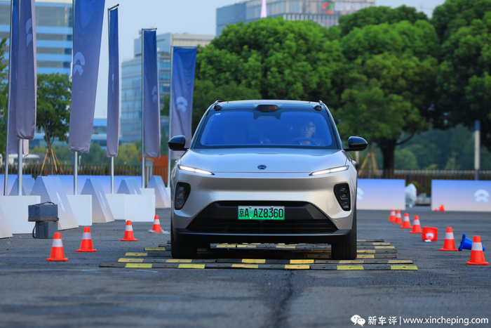 我们先说一下在场地内体验“连续减速带组成的颠簸路面”的感受,这点是比较让我惊喜的。首先是先驾驶着新一代蔚来ES8,以大概40km/h的时速通过,我在车内感受不到明显的路面冲击传递到车内,只有很轻微的路感,大概就是你能感受到车轮碾过了异物,但不会产生过多的车身跳动。这也意味着这套悬挂系统有着比较好的响应性,能将颠簸很好地进行过滤。